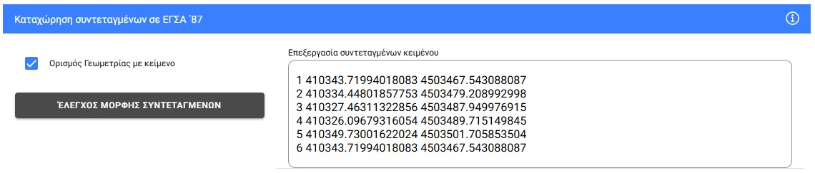 - Πατάμε «ΕΛΕΓΧΟΣ ΜΟΡΦΗΣ ΣΥΝΤΕΤΑΓΜΕΝΩΝ» για να επιβεβαιώσουμε την ορθότητά τους.