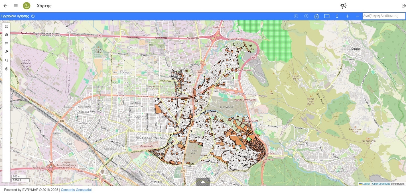 Με μια πρώτη ματιά ο χρήστης βλέπει το χάρτη της περιοχής μελέτης με όλα τα καταχωρημένα ακίνητα, όπου με τη χρήση του ποντικιού και συγκεκριμένα με τη ροδέλα του ποντικιού μπορεί να κάνει «zoom in» ή «zoom out» στο χάρτη ενώ με αριστερό «κλικ» ο χρήστης μπορεί να μετακινήσει την εστίαση του χάρτη.