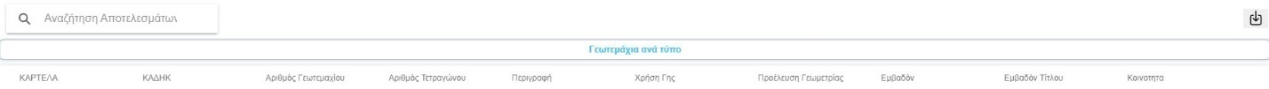 Στο παράθυρο αυτό υπάρχει η δυνατότητα «φιλτραρίσματος» των αποτελεσμάτων αναζήτησης (αριστερή θέση της παρακάτω εικόνας) για πιο γρήγορο εντοπισμό των επιθυμητών αποτελεσμάτων. Ακόμα, η εξαγωγή στην επιθυμητή μορφή CSV, Shapefile ή DXF, γίνεται με το κουμπί του «download» στη δεξιά πλευρά.