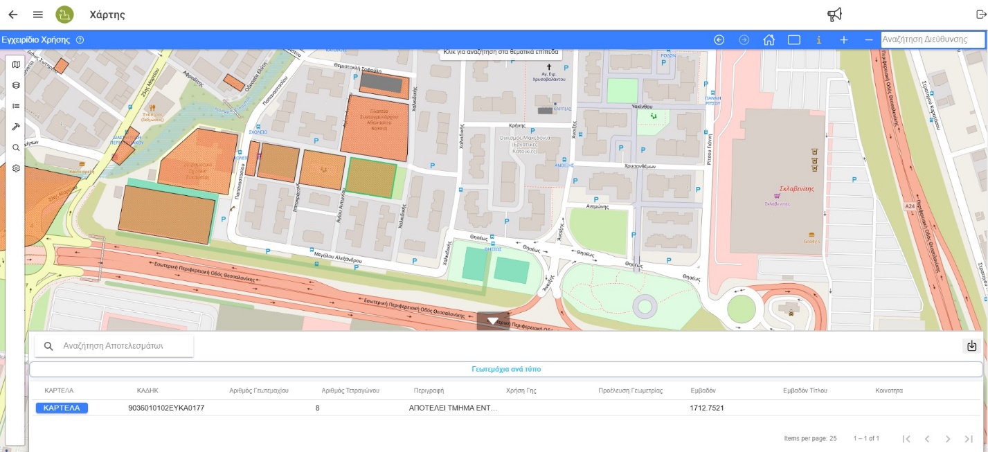 *Σημείωση: Για να μπορέσει ο χρήστης να πραγματοποιήσει την επόμενη αναζήτηση μέσω της λειτουργίας “Αναγνώρισης αντικειμένων στο χάρτη”, πρέπει πρώτα να επιλέξει ένα σημείο εκτός του ανοιχτού θεματικού επιπέδου. Με την επιλογή του παραλληλογράμμου, μπορεί στη συνέχεια να επιλέξει κανονικά το επόμενο αντικείμενο απευθείας.