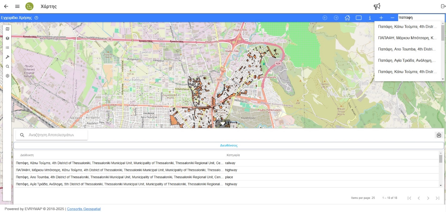 Υπάρχει η δυνατότητα για αναζήτηση κάποιας διεύθυνσης. Πληκτρολογώντας κείμενο στο κατάλληλο πεδίο (πάνω δεξιά) και στη συνέχεια πατώντας “Εnter”, εμφανίζονται οι εγγραφές που πληρούν τα στοιχεία αναζήτησης του κειμένου στο κάτω μέρος της οθόνης και με επιλογή κάποιας εκ των εγγραφών ο χάρτης μας μετακινεί στην συγκεκριμένη οδό.