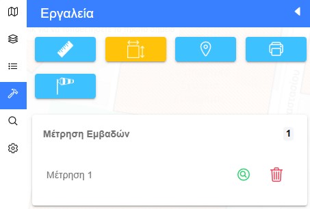 - Μέτρηση Εμβαδών: Μια επίσης πολύ σημαντική λειτουργία είναι η μέτρηση εμβαδών. Ο χρήστης αφού ενεργοποιήσει την λειτουργία, κάνοντας κλικ στον χάρτη μπορεί να μετρήσει οποιαδήποτε έκταση επιθυμεί ολοκληρώνοντας την μέτρηση πατώντας στο πρώτο σημείο του πολυγώνου. Η λίστα με τις μετρήσεις εμφανίζεται στο κάτω μέρος του συγκεκριμένου μενού, με επιλογές για εστίαση και διαγραφή.