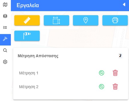 - Μέτρηση Απόστασης: Ο χρήστης αφού ενεργοποιήσει την λειτουργία, κάνοντας «κλικ» στον χάρτη μπορεί να μετρήσει οποιαδήποτε απόσταση ολοκληρώνοντας την μέτρηση πατώντας σε κάποιο υπάρχον σημείο. Η λίστα με τις μετρήσεις εμφανίζεται στο κάτω μέρος του συγκεκριμένου μενού, με επιλογές για εστίαση και διαγραφή.
