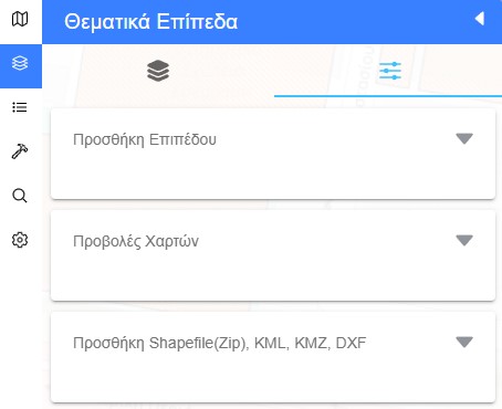 - Προσθήκη shapefile (zip), kml, kmz, dxf: Στην καρτέλα των θεματικών επιπέδων υπάρχει η δυνατότητα για εισαγωγή επιπέδου από το προσωπικό αρχείο του χρήστη. Το αρχείο αυτό μπορεί να είναι της μορφής Shapefile, kml, kmz & dxf. Έτσι, κλικάρoντας στην επιλογή “Επιλογή αρχείου”, ο χρήστης αφού εισάγει το επιθυμητό αρχείο, μπορεί να πραγματοποιήσει αλλαγές ως προς τον τρόπο εμφάνισής του (χρώμα γραμμής, πλάτος γραμμής, μέγεθος σημείου, διαφάνεια) και να το προσθέσει με το πλήκτρο.