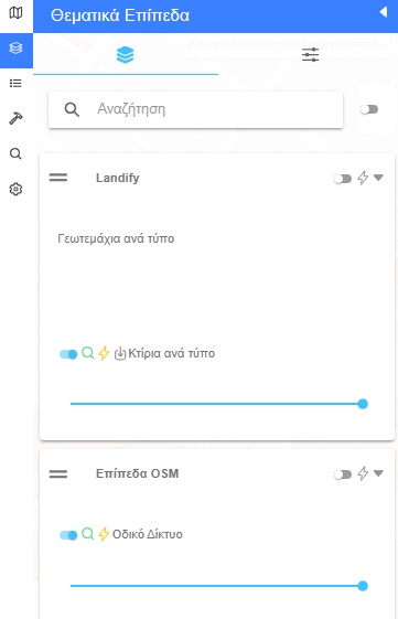 Στην 3η καρτέλα ο χρήστης μπορεί να επιθεωρήσει τα θεματικά επίπεδα που έχουν εισαχθεί στην εφαρμογή με τον αντίστοιχο συμβολισμό τους. Πρόσθετα, υπάρχει η δυνατότητα για αναζήτηση συγκεκριμένου επιπέδου πληκτρολογώντας κείμενο στο πεδίο της αναζήτησης.