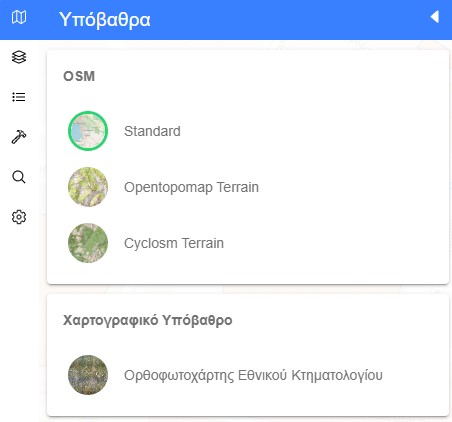 Υπάρχει η δυνατότητα για εναλλαγή μεταξύ διαφορετικών χαρτογραφικών υποβάθρων όπως είναι οι Ορθοφωτοχάρτες του Εθνικού Κτηματολογίου, το βασικό υπόβαθρο που παρέχει το OpenStreetMap κ.ά. , καθώς και η προσθήκη άλλων επιθυμητών υποβάθρων.