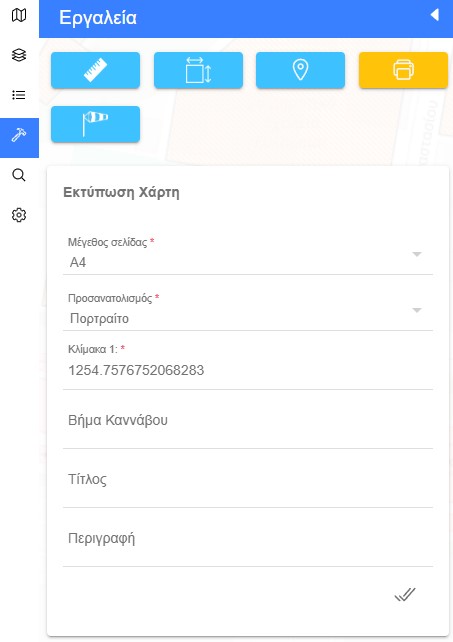 - Εκτύπωση Χάρτη: Με αυτήν την επιλογή ο χρήστης μπορεί να εκτυπώσει περιεχόμενο του χάρτη με δυνατότητα παραμετροποίησης: μεγέθους της σελίδας, προσανατολισμού, κλίμακας, βήμα καννάβου, τίτλου και περιγραφής.