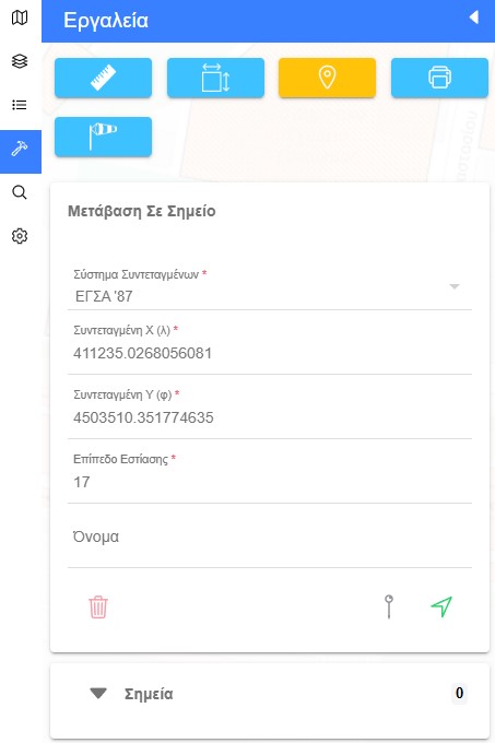 . Ο χρήστης μπορεί να πραγματοποιήσει εναλλαγή του συστήματος συντεταγμένων μεταξύ γεωγραφικών συντεταγμένων (GPS), συντεταγμένων Google, ΕΓΣΑ ’87 και CRS:84, ανάλογα με τις προτιμήσεις και τα διαθέσιμα δεδομένα. Επίσης, υπάρχει η δυνατότητα για επιλογή στο χάρτη και εμφάνιση των συντεταγμένων, κάνοντας κλικ στο εικονίδιο