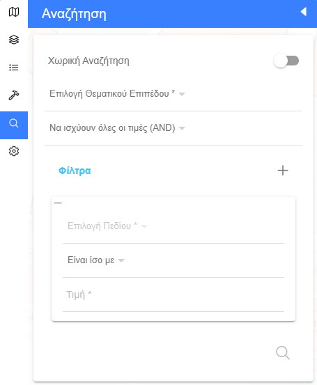 Στην λειτουργία της αναζήτησης ο χρήστης επιλέγει το θεματικό επίπεδο που τον ενδιαφέρει και το χαρακτηριστικό του θεματικού επιπέδου στο οποίο θέλει να πραγματοποιήσει την αναζήτηση. Επιπλέον, μπορεί να εισάγει φίλτρο επιλέγοντας τον αντίστοιχο τελεστή (είναι μεγαλύτερο από, ίσο με κ.ά.) για να ορίσει ειδικότερα την αναζήτησή του και να επιλέξει το εικονίδιο του μεγεθυντικού φακού.