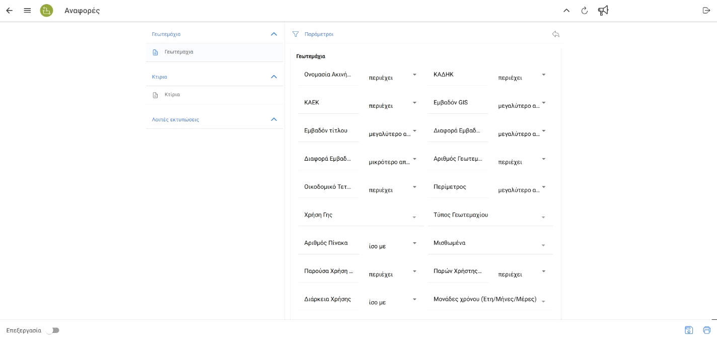 - Ο χρήστης μπορεί να επιλέξει μία από τις διαθέσιμες κατηγορίες, όπως Γεωτεμάχια ή Κτίρια.