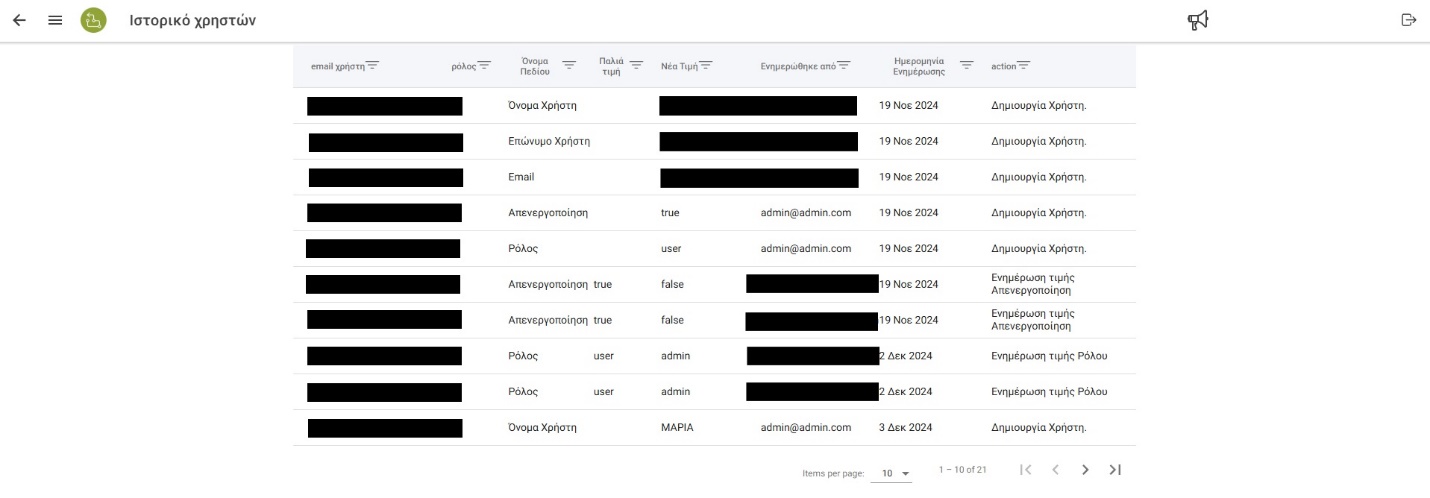 Η επιλογή «Ιστορικό Χρηστών» καταγράφει: