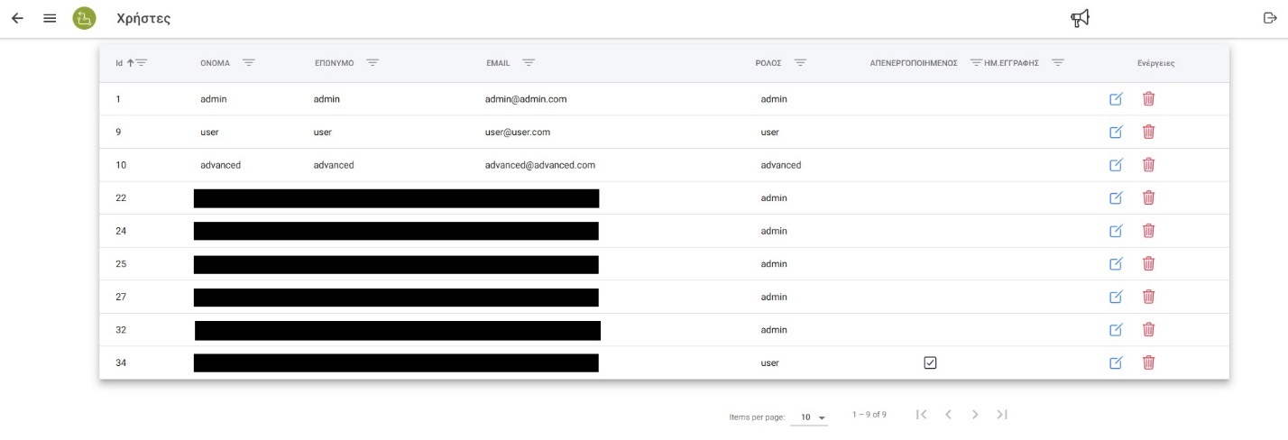 Στην επιλογή «Χρήστες», παρέχεται η δυνατότητα: