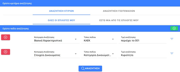 - Επιλέξει μεταξύ αναζήτησης Κτιρίων ή Γεωτεμαχίων.