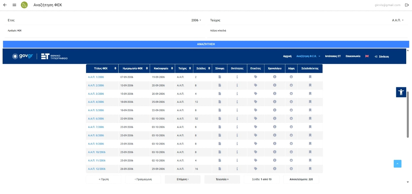 - Η εφαρμογή αντλεί τα αντίστοιχα ΦΕΚ από το Εθνικό Τυπογραφείο και τα εμφανίζει στην οθόνη.