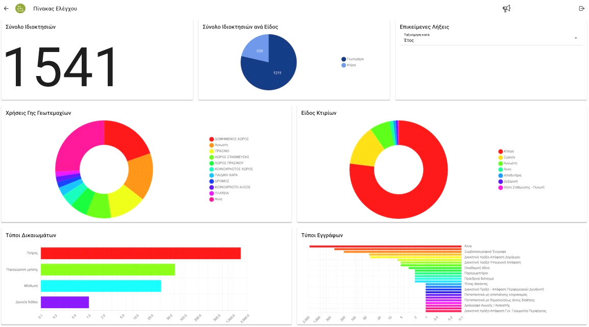 Ο Πίνακας Ελέγχου αποτελεί ένα χρήσιμο εργαλείο για την παρακολούθηση, την ανάλυση και τον έλεγχο της συνολικής εικόνας της δημοτικής περιουσίας, διευκολύνοντας τον χρήστη στη λήψη αποφάσεων και στον προγραμματισμό ενεργειών.
